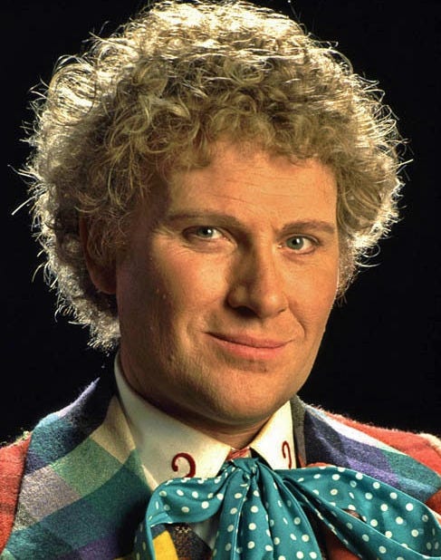 In the corner, I spot a man, with curly blonde hair, lounging with his feet up. it’s Colin Baker, the former Doctor Who. Suddenly, I notice a poster on the wall. It features his face, encircled by smaller images of his five children,